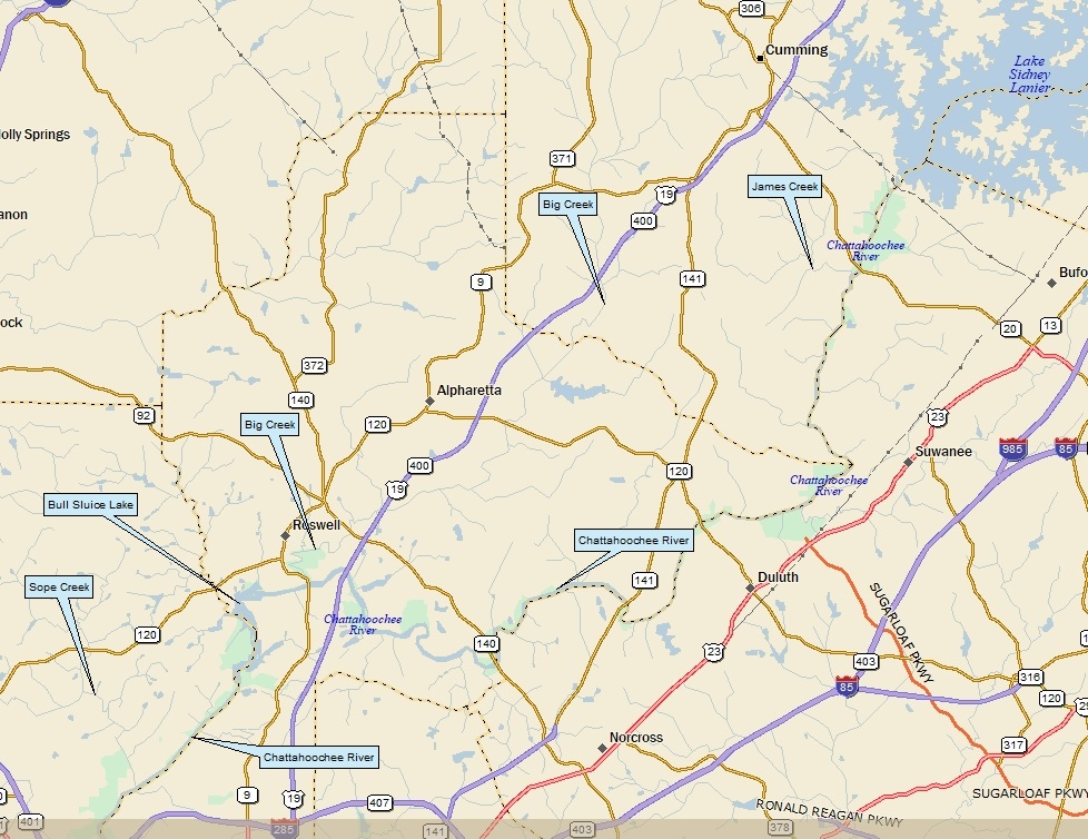 Lake Lanier Downstream, south of I-285 w/roadmap